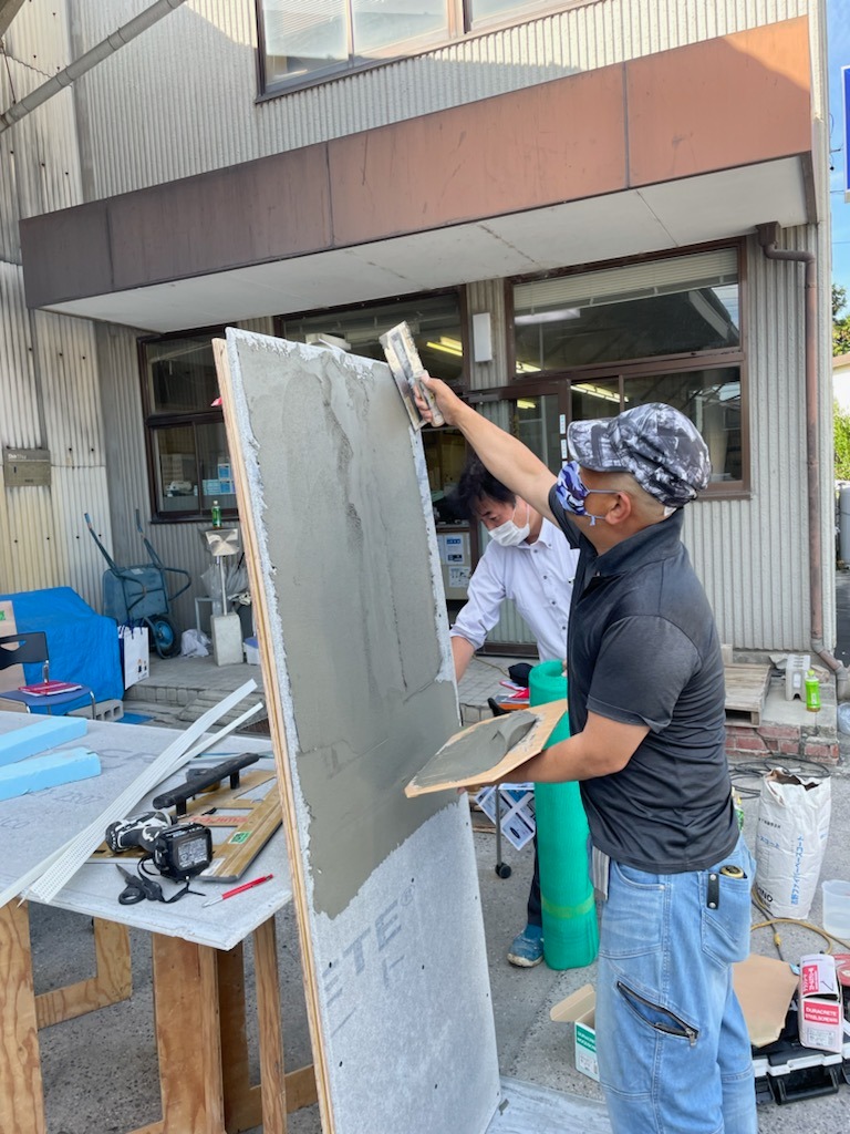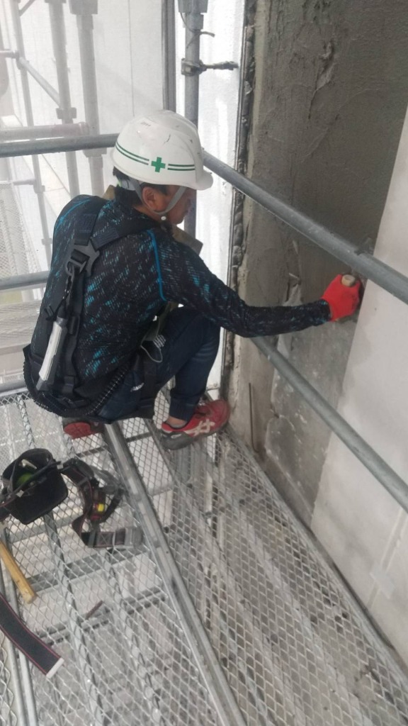 モルタルを調合し塗り上げるまでの一連の作業を行っています。